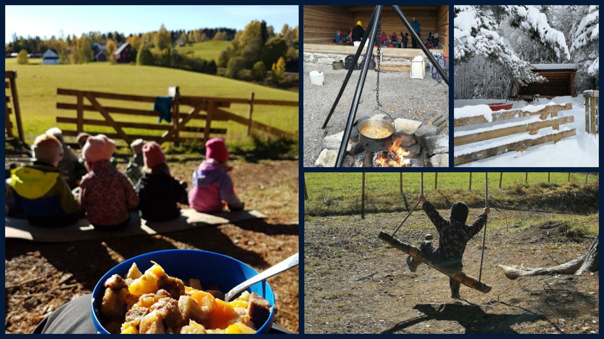 Haugerudtoppen er et turmål vi bruker ofte. Stedet ligger i gangavstand fra barnehagen. Her er det mange muligheter for variert lek. Vi går på tur med sekk med mat og drikke i. Ofte koser vi oss med mat laget på bål eller stormkjøkken.